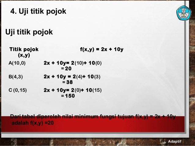 Turunan nilai maksimum dan nilai minimum suatu fungsipembina : Turunkan fungsi f(x) dan faktorkan jika ada. Nilai stasioner dan titik stasioner. Nilai maksimum dan minimum serta menuliskan hasil kedalam bentuk p ≤ f(x) ≤ q. Untuk menentukan nilai maksimum atau nilai minimum suatu fungsi tujuan bukanlah suatu hal yang sulit apabila sudah diketahui daerah penyelesaian dari sistem pertidaksamaan.