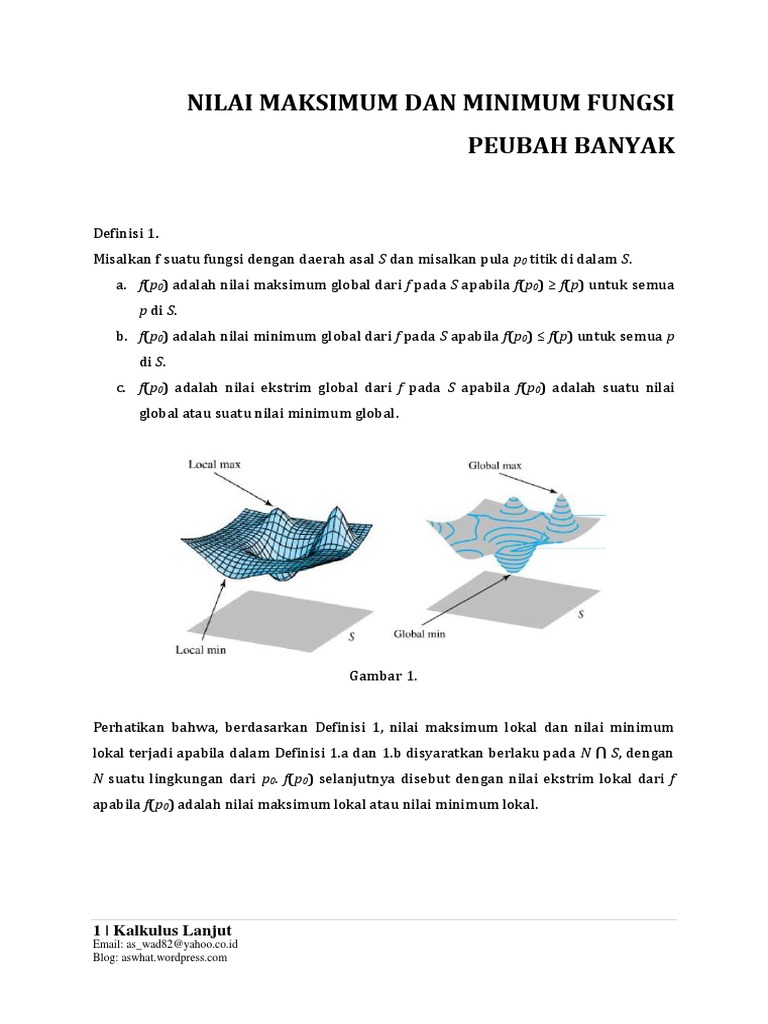 Untuk setiap titik p(x,y) pada fungsi trigonometri memiliki hubungan tentukan nilai maksimum, minimum, dan amplitudo fungsi tersebut. Dilansir dari differential equations (2010) oleh vasishtha dan sharma, persamaan turunan merupakan persamaan yang berisi variabel dependen dan independen serta turunan yang berbeda dari variabel dependen. Turunkan fungsi f(x) dan faktorkan jika ada. 8 nilai maksimum dan minimum mutlak (selang tertutup) teorema (nilai ekstrim fungsi duavariabel) jika f kontinu pada himpunan tertutup dan terbatas, d r2, maka f mencapai nilai maksimum mutlak f(x1,y1) di (x1,y1) d dan mencapai nilai minimum mutlak f(x2,y2) di (x2,y2) d. Tercapainya nilai maksimum dan nilai minimum fungsi kuadrat tergantung pada koefisien (pengali) , x2 yang penjelasannya adalah sebagai berikut: