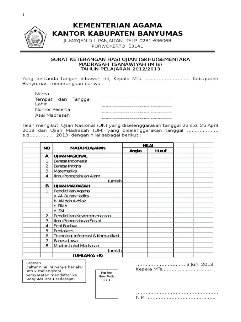 Berikut terlampir surat dari puspendik. Silahkan lihat di bawah ini: Yang bertanda tangan dibawah ini, kepala mts. Unduh berbagai macam aplikasi surat keterangan hasil ujian skhu sementara untuk sd mi mts smp sma ma. Bahwa data skhun yang diisikan adalah nomor peserta un dari smp/mts/paket b, contoh:
